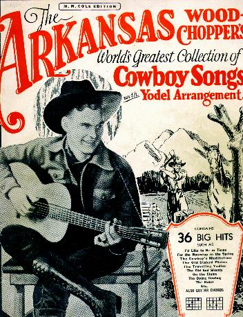 * The Arkansas Woodchopper's world's greatest collection of cowboy songs with yodel arrangements. Chicago: M. M. Cole Publishing, 1932. 66pp On cover: "Contains 36 big hits," but 37 included.
